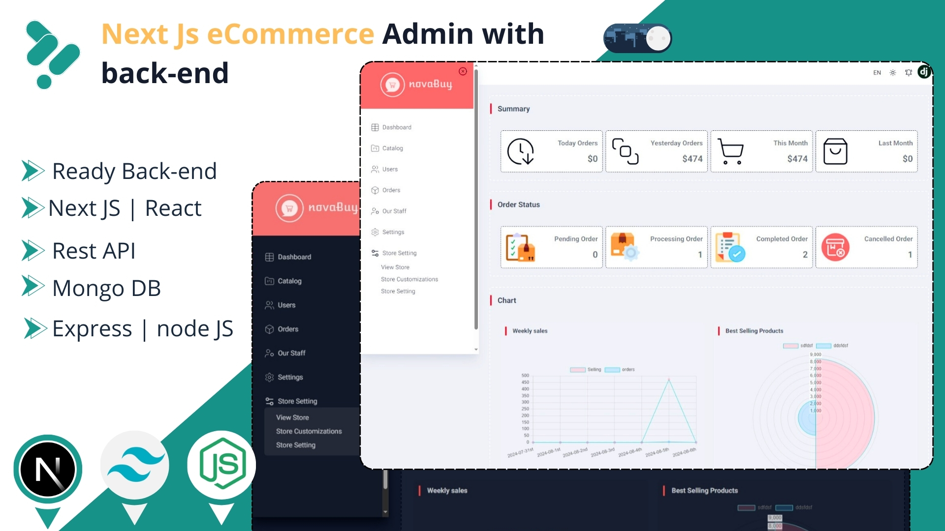 Using lazy loading and react.js, the admin dashboard was created. The tailwindcss utility-first CSS framework is used in the design of the admin dashboard and the Nova store.